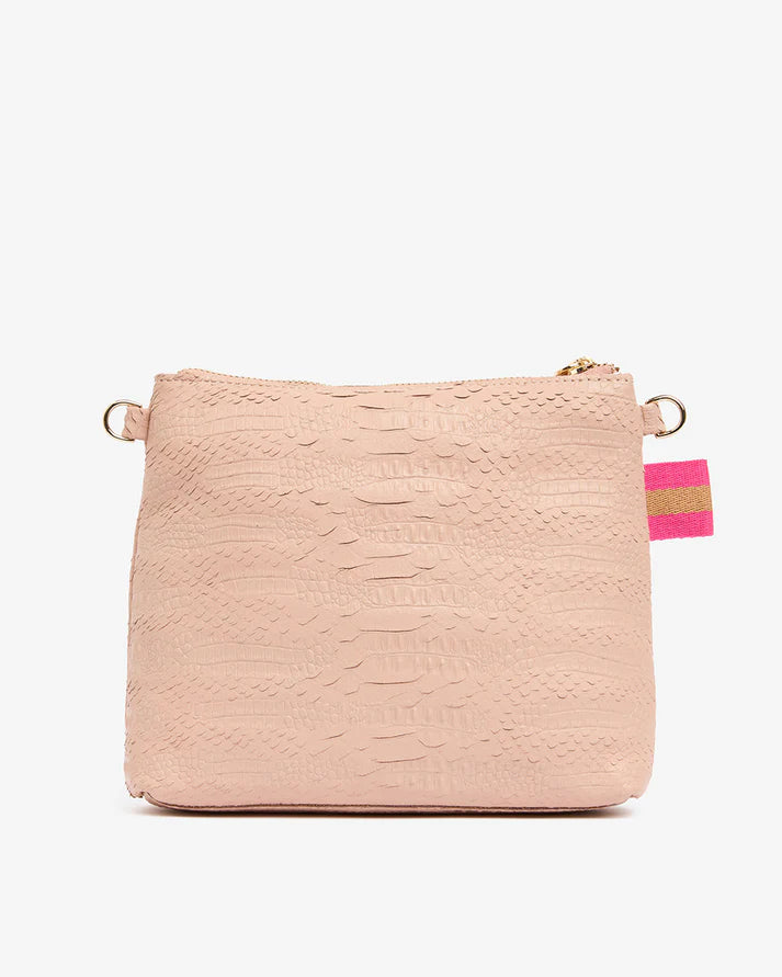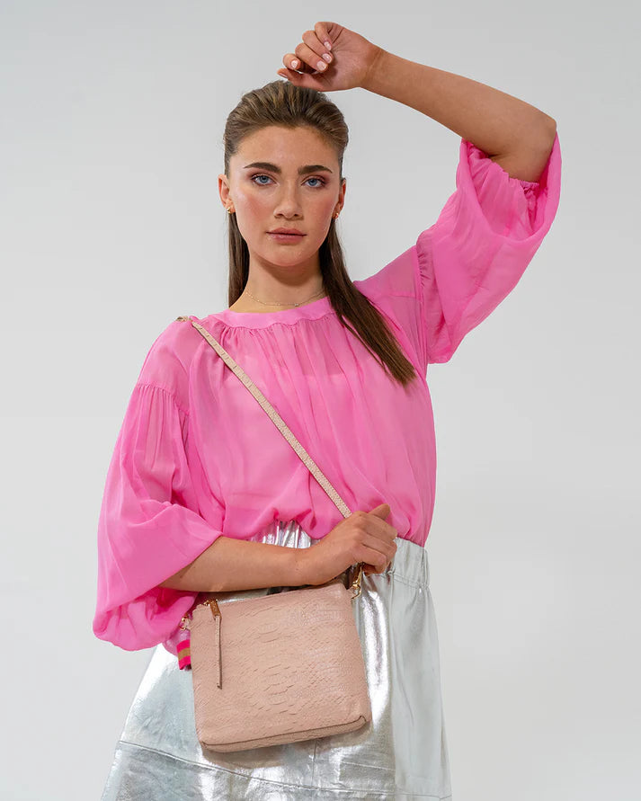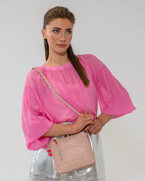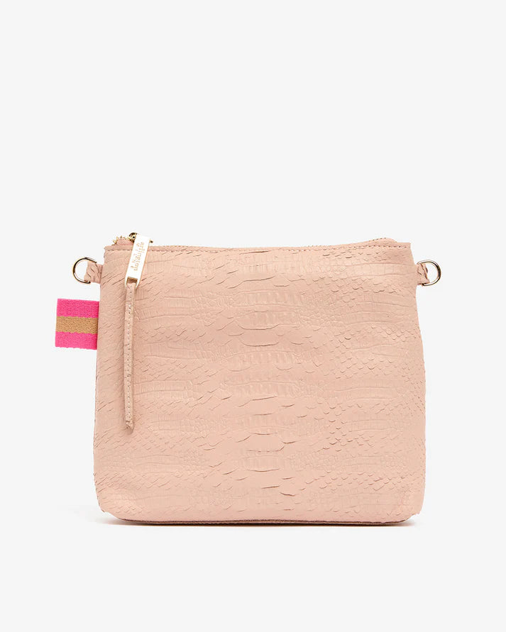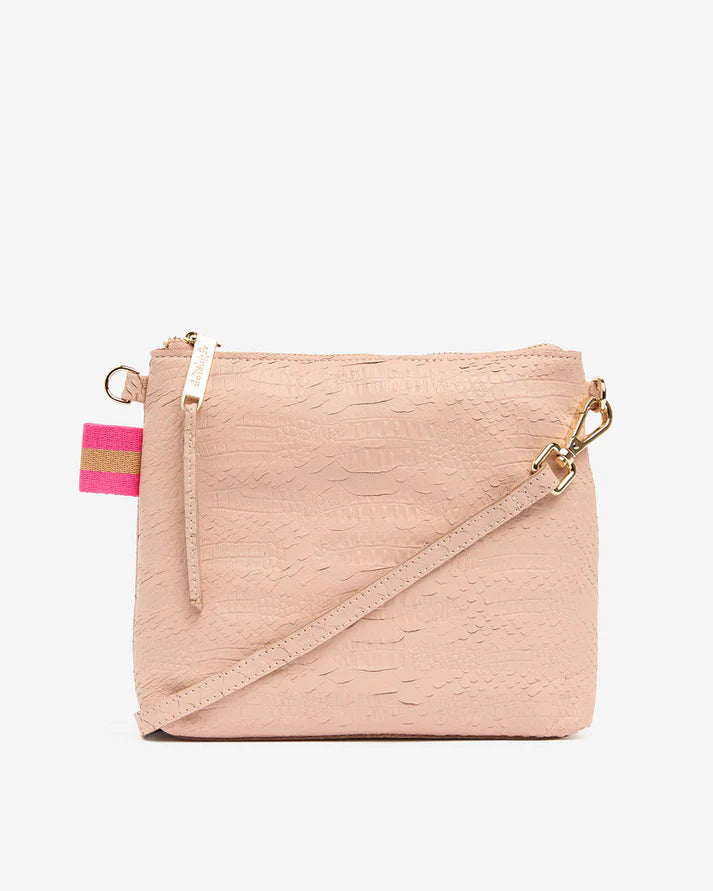 The Arlington Milne Alexis Crossbody Bag is crafted from premium leather. The bag features light gold hardware, an embossed logo and an adjustable/removable crossbody strap with raw edge detail. Secured with a top zipper, the bag opens to reveal Arlington Milne's signature hot pink lining and 3 leather card slots.