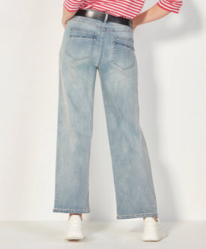 Cut from stretch cotton-blend, they’re shaped to sit at mid-waist, then fall into roomy wide legs that finish below the ankle.